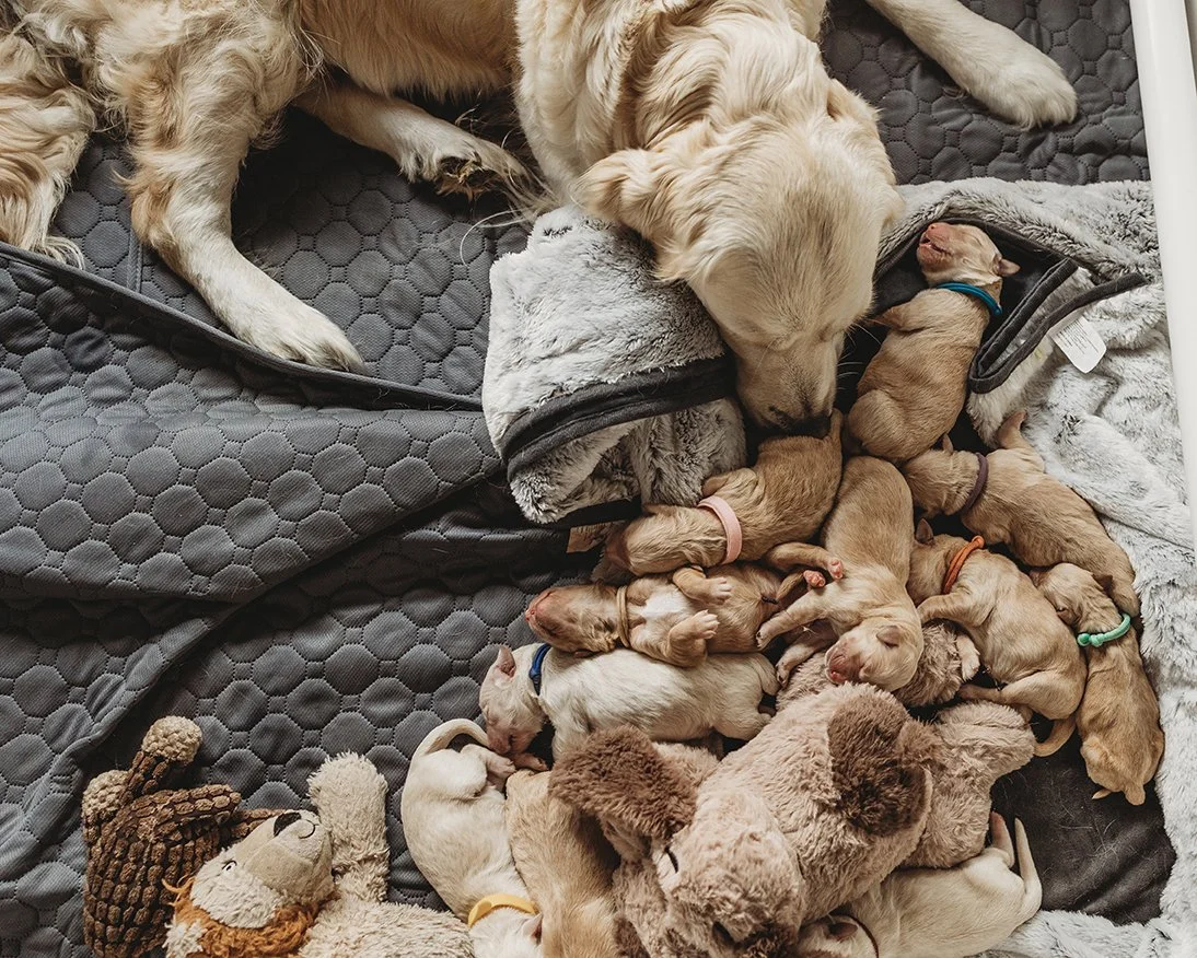 She has just had her final litter with chosen sire (see below). The number of litters is always limited for our girls and they are always closely monitored by our local vet throughout the entire pregnancy as her health is our number one priority. Afterall, they are our furbaby first and foremost.